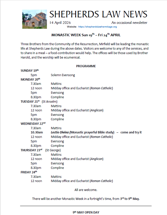 We are delighted to share the April 2026 edition of Shepherds Law News. To stay connected with life at the Hermitage, please visit shepherdslawhermitage.org.