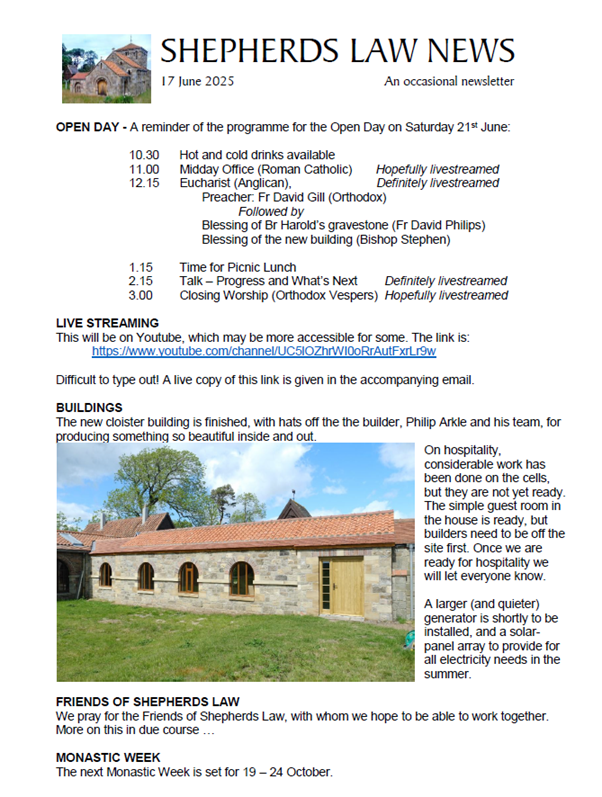The June 2025 edition of Shepherds Law News brings the latest updates from the Hermitage, including news on recent building progress, hospitality plans, and a look ahead to October’s Monastic Week.