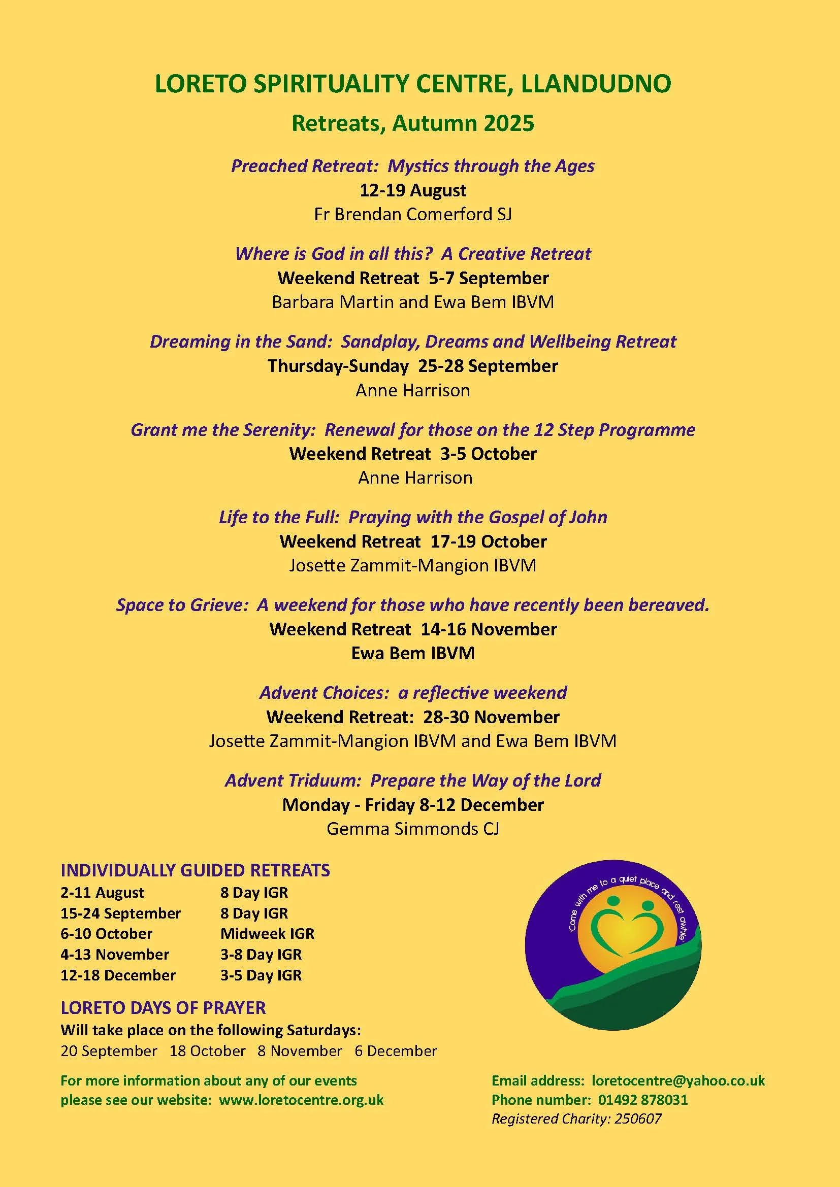 Tucked beside the Great Orme on the North Wales coast in Llandudno, the Loreto Spirituality Centre offers a peaceful haven for prayer, rest, and reflection. Run by the IBVM/Loreto Sisters, the Centre hosts a variety of individually guided and themed retreats, welcomes groups and conferences, and provides quiet time for individuals seeking solace in beautiful surroundings.
